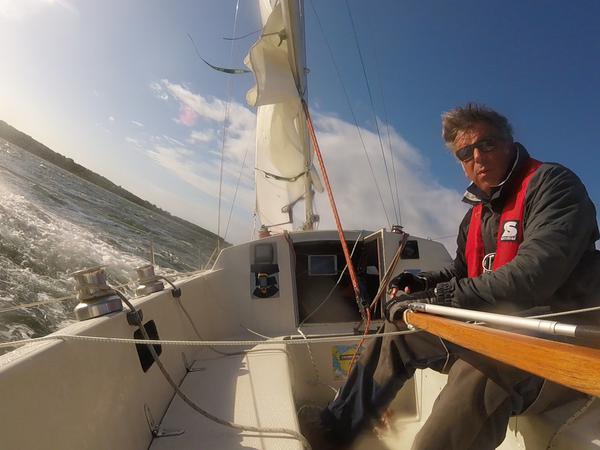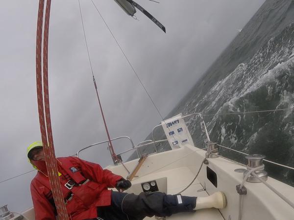 Dann fliegt der Reffknoten aus dem Großsegel, der es am Großbaum fixiert. Und plötzlich muss ich raus aus der geschützten Zone des Cockpits. Das Segel könnte jeden Moment auch die letzte Sicherung verlieren, die es in Position hält. Halb gehend, halb kniend erreiche ich den Mast, berge es, korrigiere die Leine, setze das Segel wieder. Eine elektronische Selbststeueranlage habe ich nicht, die das Boot währenddessen auf Kurs halten würde. Stattdessen vertraue ich auf einen simplen Gummizug, mit dem die Ruderpinne zu beiden Seiten verspannt ist. Er hält das Steuer mittschiffs und das Boot lange genug auf Kurs, dass ich auf dem Vorschiff arbeiten kann. Nach wenigen Minuten ist dieses erste Problem behoben.