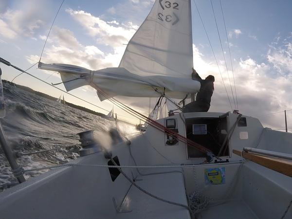 Am nächsten Morgen ist der Himmel klar und kalt. Am Start viel Gedränge. Boote, die nur von einer Person gesteuert werden, auf engstem Raum kreuzen zu lassen, ist eine heikle Angelegenheit. Da kann schnell mal eine Schot festklemmen, ein Manöver verunglücken, und schon ist die Kollision passiert. Von hinten schiebt die Strömung mit voller Fahrtgeschwindigkeit durch den engen Svendborg-Sund, droht einen vor dem Signal über die Linie zu schieben, so dass die Boote in dem aufgewühlten, gurgelnden Wasser wie auf einer Drehscheibe umeinander rotieren. Die Ersten kehren bereits um.