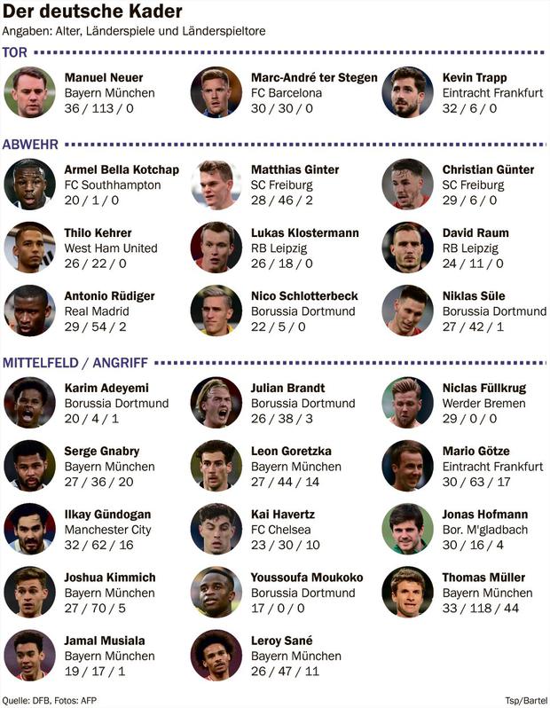 Die Spieler Thomas Müller und Matthias Ginter gehören neben Torhüter Manuel Neuer hingegen eher zum WM-Urgestein. Auch der 30-jährige Mario Götze darf nach fünf Jahren endlich wieder im Nationaltrikot auflaufen.