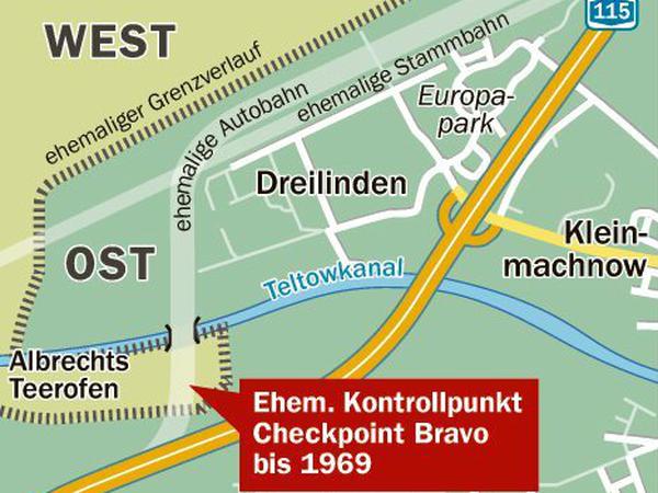 Es braucht schon viel Fantasie, will man die Atmosphäre des ersten Checkpoints Bravo an Ort und Stelle nachempfinden. Vom Kontrollpunkt der Alliierten ist wenig geblieben. Allenfalls eine Ahnung. Von einem Dornröschenschlaf zu sprechen, wäre in der Lage Albrechts Teerofen völlig deplatziert: Auf der östlichen Seite – in Drewitz – nämlich wurden Menschen drangsaliert und schikaniert. Hier wurden der alte Autobahnanschluss und Kontrollgebäude schließlich demontiert. Nach 1969 – nach Inbetriebnahme des neuen Übergangs Dreilinden – konnten sich hier bis zur Maueröffnung 1989 lediglich die Angehörigen der DDR-Grenztruppen auf den stillgelegten Streckenabschnitten bewegen.