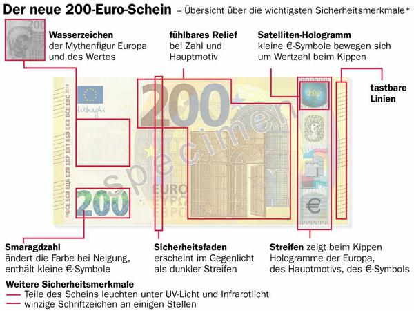 39.700 gefälschte Euro-Scheine im Gegenwert von 2,2 Millionen Euro hatte die Bundesbank noch im ersten Halbjahr 2017 registriert, als der neue, sichere 50-Euro-Schein auf den Markt kam. 60 Prozent davon waren 50-Euro-Scheine, vor allem aus der alten Notenserie, die leichter zu fälschen war. Im ersten Halbjahr 2018 sank die Zahl der Blüten um 22 Prozent. Die neuen 100- und 200Euro-Noten sind nun mit acht Sicherheitsmerkmalen ausgestattet (siehe Grafik). Besonders sicher machen soll die unter anderem ein Hologramm rechts oben am Schein: Kippt man den Schein leicht, tanzen kleine Euro-Zeichen um eine Wertmarkierung. Auch der links unten smaragdgrün aufgedruckte Wert hat ein zweites Gesicht, wenn man den Schein kippt, reflektiert er das Euro-Zeichen. Und das Porträtfenster mit der mythischen Figur von Europa, einer Geliebten des Gottes Zeus, deren Gesicht die Europäische Zentralbank von einer antiken Vase aus dem Pariser Louvre kopiert hat, wird den Fälschern das Leben schwer machen: Hält man den Schein gegen das Licht, wird das Fenster durchsichtig, das Porträt von Europa ist dann von beiden Seiten zu sehen.