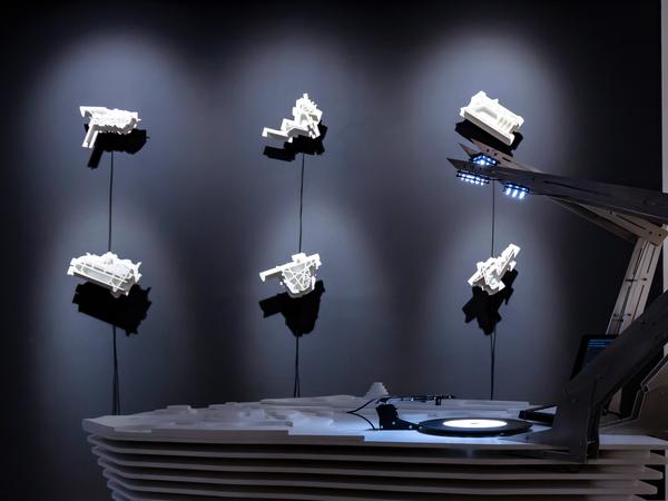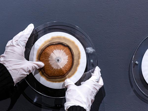 Mit weißen Stoffhandschuhen nimmt eine Assistentin Scheibe Nummer 46 von der Wand und platziert sie auf einem Drehteller, dem „Ewigkeitsscanner“. Dieser spielt die Chromatogramme wie ein Plattenspieler ab und verwandelt die visuellen Informationen mithilfe einer KI in Klänge: Je weniger Leben im Boden ist, desto stiller ist es im Raum.