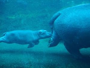 Der Nachwuchs im Berliner Zoo ist ab sofort täglich für Besucher zu sehen. Beim ersten Ausflug ins Hippo Bay schob Mutter Nala ihr Junges immer wieder behutsam ins Flache.