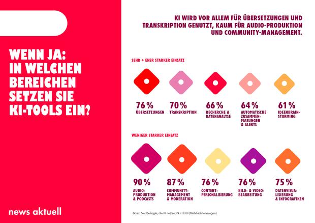 Hamburg (ots) - Künstliche Intelligenz ist im Redaktionsalltag angekommen: 70 Prozent der Journalistinnen und Journalisten nutzen bereits KI-Tools für ihre Arbeit - vor allem für Übersetzungen und Transkriptionen. Für Audio-Produktionen oder Community-Management werden die Tools dagegen kaum genutzt. Gleichzeitig sehen viele Medienschaffende die Entwicklung kritisch: Die Mehrheit befürchtet, dass Desinformationen durch den Einsatz von KI weiter zunehmen könnten. Dies geht aus dem aktuellen Medien-Trendmonitor 2025 von news aktuell hervor. Mehr als 1.000 Journalistinnen und Journalisten aus Deutschland, Österreich und der Schweiz haben an der Umfrage der dpa-Tochter teilgenommen.