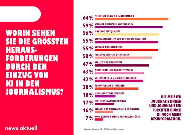 Trotz des breiten Einsatzes sehen viele Journalistinnen und Journalisten die Nutzung von KI auch kritisch. Besonders groß ist die Sorge vor einer weiteren Zunahme von Fake News und Desinformationen (64 Prozent).