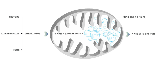 NADH wird vom Körper selbst aus Kohlenhydraten, Proteinen und Fetten in einem äußerst komplexen Prozess chemischer Reaktionen - dem Citratzyklus - in den Mitochondrien erzeugt.