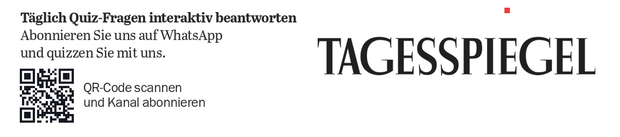Der Tagesspiegel ist jetzt auf WhatsApp und lädt Sie herzlich ein, mit uns zusammen zu quizzen. Täglich senden wir Ihnen Rätsel und Fragen und Sie können interaktiv mitraten. Jetzt hier kostenlos abonnieren.