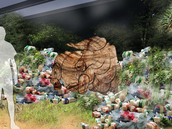 Auf dem Weg begegnen ihnen dystopische Mischwesen aus Mensch und Maschine – und die Überreste der Konsumkultur. Da liegt eine Kuh zwischen Plastikmüll, da lösen sich übergroße Werbetafeln im Staub auf.