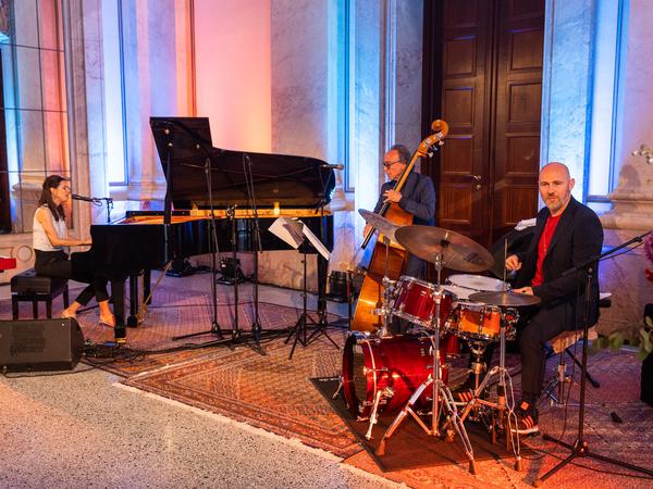 Nach dem Rückblick auf die wechselvolle Geschichte bringt das „Olivia Trummer Trio“ unter dem Titel „Dialogue’s Delight: a new start“ den Abend mit einem Jazzkonzert in Schwung. Das passt. Die gebürtige Stuttgarterin hat nach Jahren in New York und Berlin in der italienischen Jazz-Szene ihre künstlerische Heimat gefunden und moderiert auch ausschließlich in der Sprache ihres Herzens. Mit im Spiel sind Rosario Bonaccorso und Nicola Angelucci.