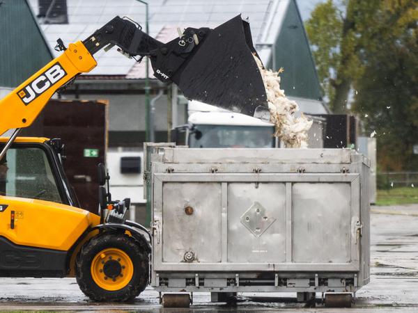 Ein dpa-Reporter beobachtete, wie ein Traktor schaufelweise Kadaver in einen Container kippte, während weiße Federn durch die Luft flogen. Als nächster Schritt werden Kreisangaben zufolge die Ställe desinfiziert. Diese dürfen dann für 30 Tage nicht betreten werden. Die Türe müssen aufgrund der Geflügelpest getötet werden. Brandenburg ist besonders stark betroffen. Allein im Landkreis Märkisch-Oderland müssen in zwei Betrieben 130.000 Hühner und Enten gekeult und in Tierverbrennungsanlagen entsorgt werden.