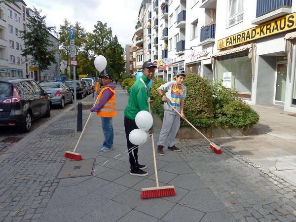 Für den Kiezputz in Alt-Tegel fegten Schüler und Senioren gemeinsam die Brunowstraße. Dazu nahmen die etwa fünfzig Personen kurzerhand einen Besen in die Hand und hängten sich einen orangenen BSR-Kittel um. Mit dabei sind Schüler aus der im Kiez gelegenen Julius-Leber Sekundarschule und ältere Sportler vom VFL Tegel. „Wir wollen, dass die älteren Anwohner sehen, dass uns die Natur am Herzen liegt“, sagen Dennis, Mohamad und Kevin, die in die siebte Klasse gehen. Die Aktion sei gleichzeitig ein „Generationentreff“, sagt Initiator Michael Grimm, Leiter der „AG Kunst und Kultur in Tegel“. Erfolgreich sei auch die Suche nach Baumstiftern gewesen. Ende Juni hatte ein schwerer Sturm die Bäume in der Brunowstraße zerstört. Für 250 Euro konnte jeder, der wollte, einen Baum stiften. Fünfzig Anwohner und Gewerbetreibende hatten in den letzten Wochen die Patenschaft für einen eigenen Baum erworben. Jetzt freuen sich alle darauf, dass es ab dem nächsten Jahr wieder grüner wird. Denn besonders dreckig sind die Straßen in dieser Gegend eigentlich nicht.