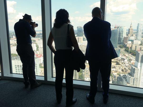Wenn man von hier oben durch die bodentiefen Fenster gen Osten blickt zur Weichsel, die die Metropole teilt, sind da etwa zehn andere Hochhäuser, die dem „Kulturpalast“ aus der Stalin-Ära die Rolle als bisher einzigem Blickfang der Skyline Konkurrenz machen. Vor zehn Jahren stand keiner davon.