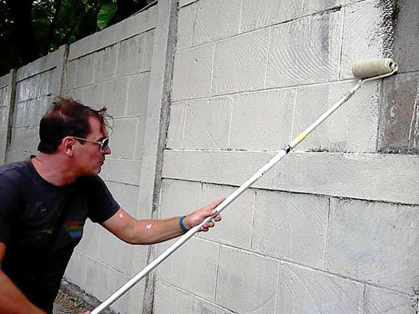 Währenddessen fangen einige der Künstler schon mal an zu grundieren. Sie kippen kleinere Mengen Gelb und Schwarz in den einzigen großen Eimer mit weißer Farbe und schütten dann die Mischung zwischen zwei Eimern hin und her. Im Nu ist fast die ganze weiße Farbe in einen schmutziggelben Farbton verwandelt. Damit wollen sie nun die Wand grundieren.