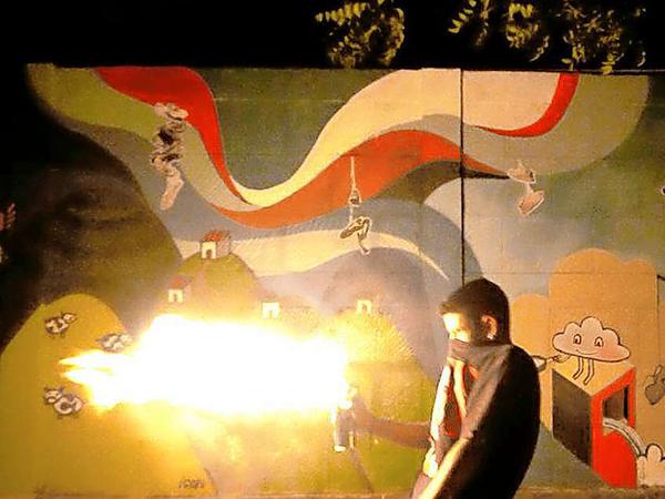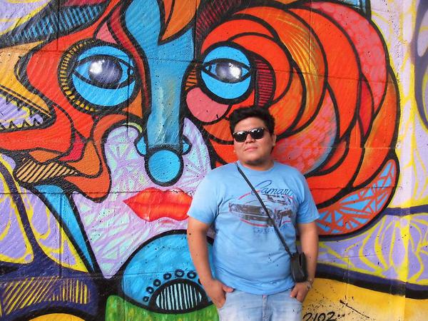 Zurück an der Wand leichte Enttäuschung, die grundierte Wand sieht im Farbton fast identisch aus wie die ungrundierte. Trotzdem schnappen wir uns Rollen und Eimer und helfen mit. Die Arbeit ist wirklich kein Spaß: Die Wand ist an vielen Stellen schimmlig, die Grundierung spritzt in alle Richtungen davon und in Kürze sehen wir aus wie paniert. Irgendwann fällt uns auf, dass außer Holger und mir keiner mehr am grundieren ist - wo sind eigentlich die Künstler? Wir gehen die Mauer zum Anfang zurück und entdecken, dass unsere Künstler bereits dabei sind, ihre ethnoartige Motive mit Spraydosen an die Wand zu skizzieren.