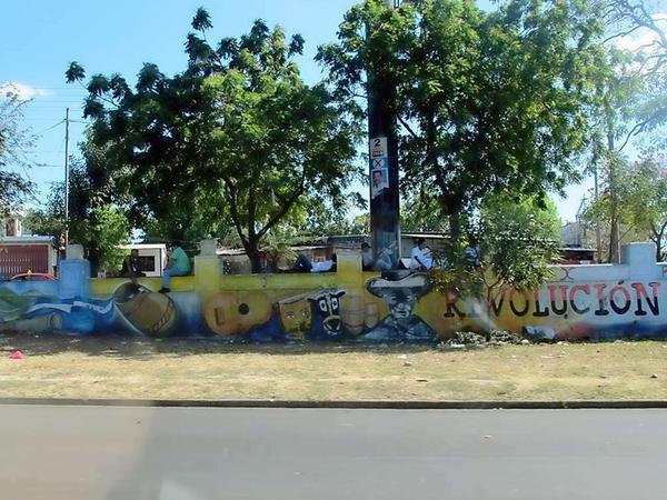 Am Frühabend treffen wir unsere Künstler in einem Szenerestaurant. Die Tische haben Andy Warhol Designs, und ein Eurodiscomix läuft in ohrenbetäubender Lautstärke. Das ist auch ganz gut so, denn unsere Künstler haben sich offenbar verabredet, so wenig wie möglich mit uns zu reden. Es sind allesamt bullige Typen mit trainierten Oberkörpern. Die meisten sprechen kein oder kaum English aber auch auf spanisch geht fast gar nichts. Einige antworten ausweichend, andere gehen dem Gespräch gleich ganz aus dem Weg. Immerhin erfahren wir, dass die Künstler sich in einem Vorabgespräch bereits auf ein Konzept verständigt haben, sie wollen die Evolutionsgeschichte malen, links Natur, rechts Großstadt und dazwischen ein großer Abschnitt mit präkolumbianischen Motiven – offenbar ein heißes Eisen in Nicaragua. Mit gemischten Gefühlen geht's zurück ins Hotel.