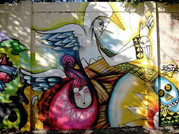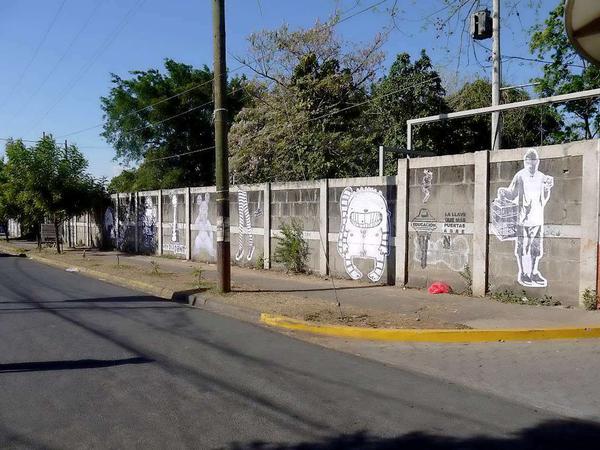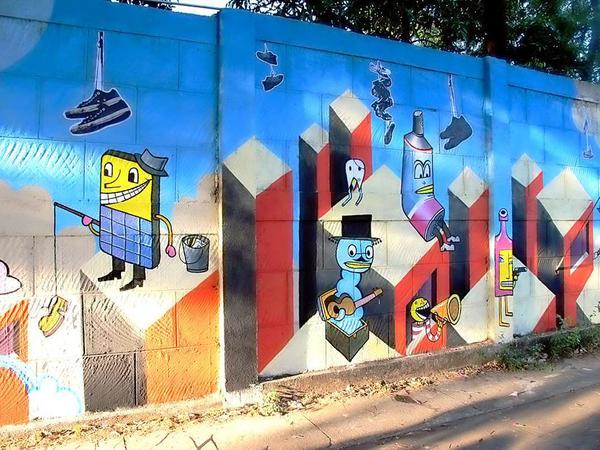Ein Tag im Zeichen der Konfrontation. Wir schauen nun selbst grimmig, grüssen nicht mehr und verkneifen uns alle Kommentare zu den Bildern der Künstler. Alle malen wortlos vor sich hin. Gelegentlich schnappt mir einer die Leiter weg, die ich dann umgehend wieder zurückklaue. Immerhin kommt man so ziemlich schnell voran. Zwei der nicaraguanische Künstler fallen etwas aus der Reihe. Einer hat selber Paste-ups mit herabhängenden Schuhen vorbereitet und beklagt sich nun, das keiner seiner Kollegen mit ihm zusammenarbeiten will. Der andere spricht etwas englisch, arbeitet bei einer NGO und ist relativ gesprächig. Er arbeitet neben mir und will mit mir zusammen einen Übergang von Land zu Stadt malen.