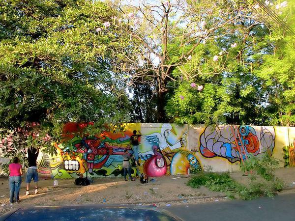 Sollte da nicht noch ein Workshop sein, in dem alle zusammen den Aufbau besprechen? Holger platzt der Kragen, er knurrt kurz die Künstler an und geht dann zurück zum Grundieren. Eine halbe Stunde lang passiert gar nichts, dann kommt Mittelsmann Xalteva und erklärt, dass die Künstler mit uns reden wollen. Nun gut – reden wir. Ich erkläre, dass unser Konzept auf Kommunikation zwischen Künstlern basiert und davon in Nicaragua nicht viel vorhanden sei. Alles ein Missverständnis erklären uns die Künstler, man sei durchaus bereit mit uns zu “verhandeln”. Also besprechen wir das Konzept. Die Künstler holen ihre Bleistiftskizzen heraus, die ich nebeneinander an die Wand klebe. Da man aber, um etwas zu ändern noch mal neu grundieren müsste, lassen wir es so wie es ist. Ich erwähne die Paste-ups aus den anderen Ländern – die nicaraguaensischen Künstler wollen keine Paste-ups. Sie erklären mir, dass Graffiti in Nicaragua erfunden wurde und dass sie sowieso die besten seien und deshalb ihre Arbeiten lieber nicht mit der Kunst der anderen Länder vermischen wollen. Einer der Künstler trägt ein T-Shirt mit dem Aufdruck “ you cant fix stupid”. Stimmt, denke ich. Frustriert gehen wir zurück ins Hotel.