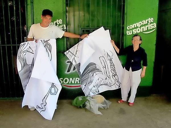 Dichtes Programm heute. Die Mauer muss fertig gemalt werden, Paste-ups geklebt, der Bibliobus soll bunt werden und wir wollen den Künstlern mit Interviews auf den Zahn fühlen. Da passt es gut, dass wir ausgerechnet heute eine Stunde zu spät abgeholt werden. Als erstes geht's zum Copyshop, wo schon eine stattliche Rolle auf uns wartet. Dann schicken wir Alicia zum Mercado, Kleister kaufen, während Holger die Paste-ups zurechtschneidet. Eine ältere Dame, in deren Kiosk wir nachts unsere Farben deponieren dürfen, hilft ihm fürsorglich dabei.