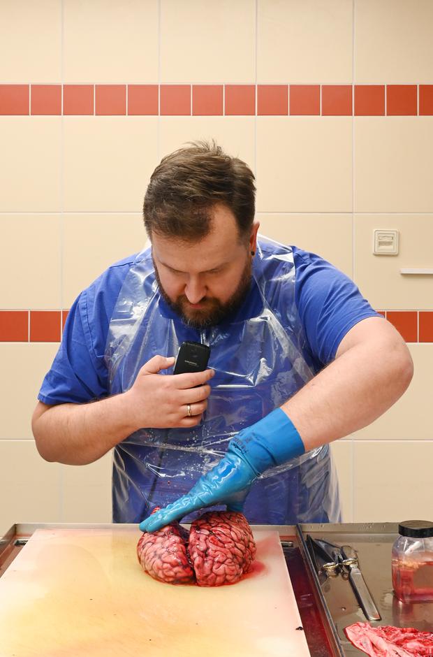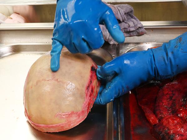 Ein Kreischen durchdringt den Sektionssaal, es riecht nach verbranntem Knochen. Lichtenstein zieht das Sägeblatt einmal um den oberen Teil des Kopfes herum, um das Gehirn des Toten freizulegen. Dann hebt sie vorsichtig die Schädeldecke ab. „Hier ist was“, sagt sie.