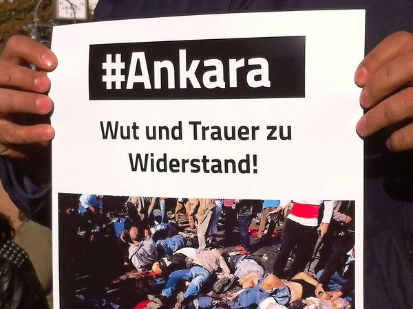 „Wut und Trauer zu Widerstand“ hieß es auf Plakaten, auf denen die Demonstranten Bilder der Opfer aus Ankara zeigten. Doch anfangs dominierte eindeutig die Trauer. Mit einer Schweigeminute gedachten die zu Beginn schätzungsweise 400 Teilnehmer den bei der Demonstration in Ankara getöteten Menschen. Später wuchs die Demonstration auf rund 1200 Teilnehmer an.