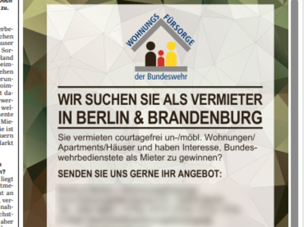 „Wir suchen Sie als Vermieter in Berlin und Brandenburg“ – so hat sich die Wohnungsfürsorge der Bundeswehr jüngst in einer Anzeige an private Eigentümer gewandt und sie gebeten, Wohnungsangebote einzureichen. Bundesweit ist ein solches Vorgehen bislang die Ausnahme, teilt ein Sprecher des Bundesamts für Infrastruktur, Umweltschutz und Dienstleistungen der Bundeswehr dem Tagesspiegel mit. Es handele sich um eine Einzelmaßnahme, es seien „derzeit keine Initiativen dieser Art aus anderen Regionen bekannt.“