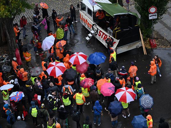 In einer Seitengasse der Warschauer Straße in Friedrichshain haben sich ein paar Dutzend Streikende versammelt, blasen in Trillerpfeifen. Viele haben sich eine orange Jacke mit dem Lieferando-Logo oder eine Warnweste übergestreift. Ein Mann läuft mit einer „Evilrando“-Folie herum. Nachmittags ziehen sie zur Firmenzentrale von Lieferando in der Schlesischen Straße. Aufgerufen zum Streik hatte die Gewerkschaft Nahrung-Genuss-Gaststätten (NGG).