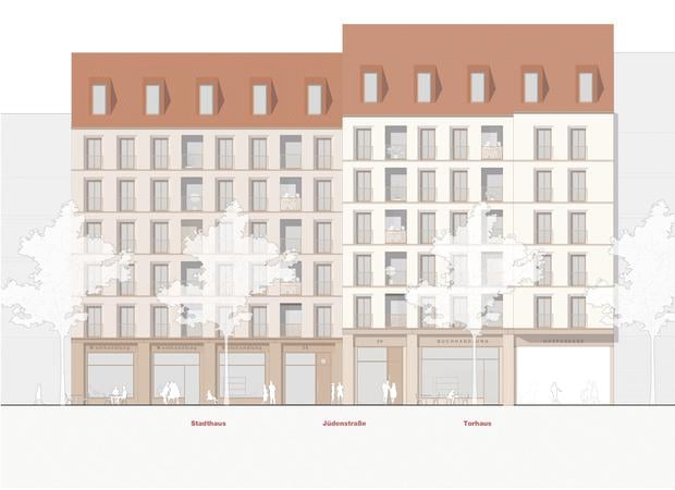 Bei Los 2 schließlich vergab die Jury zwei erste Preise, an eine Bietergemeinschaft aus Duplex Architekten, Gort Scott und Kim Nalleweg Architekten sowie an das Team von blrm Architekt*innen aus Hamburg. Dieses Los beinhaltet drei Wohnhäuser an der Jüdenstraße.