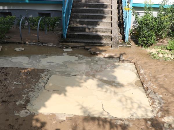 Vor der Hausnummer 13 war der Gehweg laut einem Augenzeugen so stark unter- und weggespült, dass der Haupteingang nicht zugänglich war. Laut dem zuständigen Hausmeister konnten die Bewohner allerdings einen weiteren Zugang nutzen.