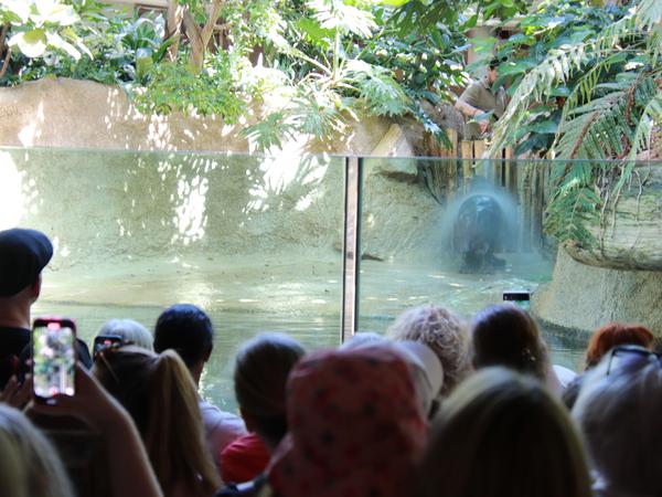 Der Tagesspiegel hat Toni bereits am Dienstag einen Abschiedsbesuch abgestattet. „Schon schade, dass sie nun umzieht“, sagt eine Frau und macht ein Foto von der kleinen Toni in der Innenanlage der Hippo Bay. „Me and Toni“, spricht eine andere aufgeregt in ihre Handykamera, als sie ein TikTok-Video von sich und dem Zwergflusspferd macht.