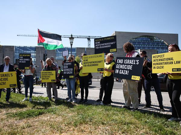 Vor dem Bundeskanzleramt versammelten sich am Montag Teilnehmer einer Protestaktion von Amnesty International. Auf Schildern war unter anderem „Herzog & Steinmeier: Keine Wertepartnerschaft für Völkermord!“ zu lesen, außerdem hielt ein Anwesender eine palästinensische Flagge in die Luft.