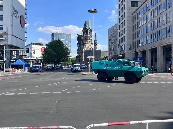 Nur auf dem Hardenbergplatz in Charlottenburg gab es am Montag kein Durchkommen für Autofahrer: Ganz in der Nähe befindet sich das Hotel, in dem der israelische Staatspräsident untergebracht wurde. Ein gepanzertes Fahrzeug der Berliner Polizei wurde auf der Kreuzung abgestellt, dazu sind Absperrungen und etliche geparkte Einsatzfahrzeuge zu sehen.