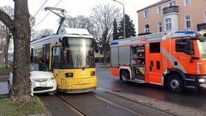 Crash am Morgen: Ein Auto wird zwischen Straßenbahn und Baum eingeklemmt. Die Feuerwehr muss anrücken.