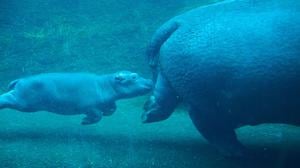 Der Nachwuchs im Berliner Zoo ist ab sofort täglich für Besucher zu sehen. Beim ersten Ausflug ins Hippo Bay schob Mutter Nala ihr Junges immer wieder behutsam ins Flache.