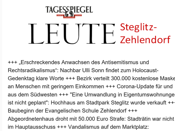 Hier noch mehr Themen, um die es im aktuellen Tagesspiegel-Newsletter für Steglitz-Zehlendorf geht.