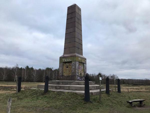 11 Meter ist das Ding hoch, eingeritzt sind kyrillische Buchstaben - Erinnerungen an die sowjetischen Soldaten, die hier übten.