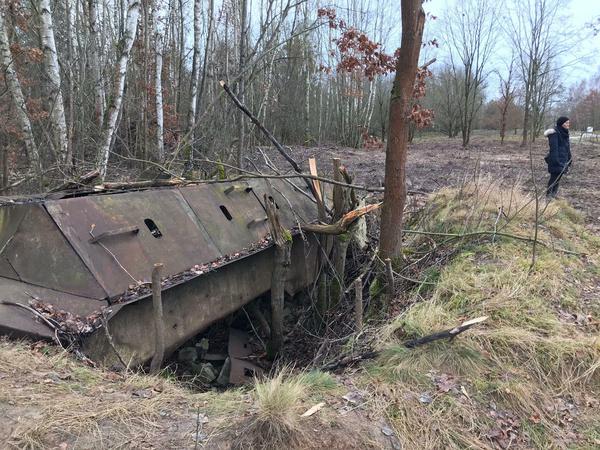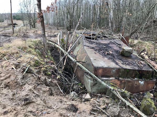 Erkennen Sie, was das für ein Militärfahrzeug ist? Räder hat es nicht (mehr); Bäume wachsen links und rechts vorbei. Es steht in einer Senke. Die Bäume und das Gestrüpp ringsherum wurden gestutzt, deshalb fällt das Ding im Winter 2020 plötzlich auf.