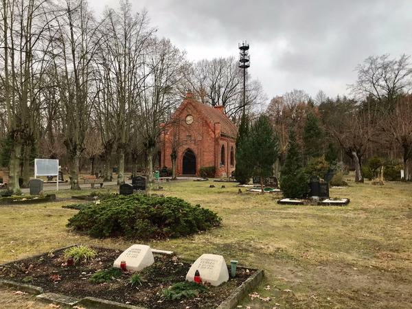 Interessant ist auch der Friedhof nebenan. Seit vielen Jahren fahren die Spandauer auf der B5 gen Outlet-Center dran vorbei (oder wenn sie zur Autobahn wollen). Beim Ausflug für den Spandau-Newsletter vom Tagesspiegel habe ich einfach mal angehalten – von der Bundesstraße ist nämlich hinter der Fußgängerbrücke ein roter Stern zwischen den Bäumen zu erkennen: ein sowjetisches Ehrenmal. Die Gräber sahen bestimmt schon mal gepflegter aus.
