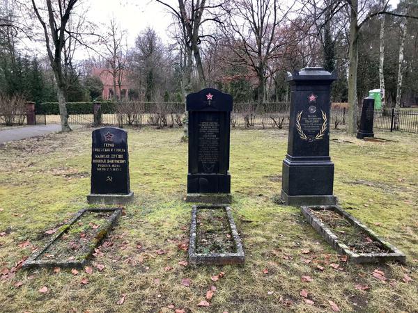 Auf dem Grabstein steht übersetzt, dass dort die „Helden der Sowjetunion“ liegen. Zum Beispiel ein Hauptmann namens Nikolai Dimitriwitsch Dugin, gestorben am 2. Mai 1945, als Spandau längst besiegt war. Und ein Major Iwan Timofejewitsch Akulenko („kämpferischer Bolschewik“, gestorben 1948).