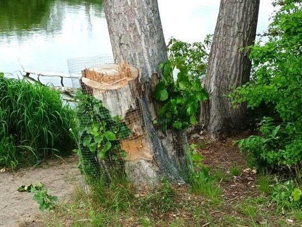 Was den Biber unbeliebt macht? Unter anderem, dass er wie bekannt an Bäumen nagt. Deshalb haben einige Bäume am Wuhlesee einen Zaun als Nageschutz. Ob bei diesem Baumstumpf - im unteren Bild - der Zaun schon vorhanden war, als der Baum noch stand, kann nur vermutet werden.
