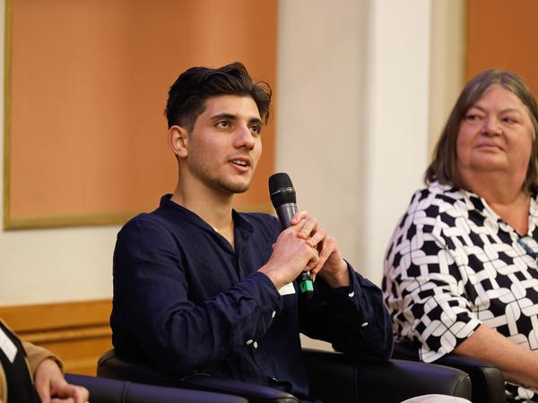 Redebeiträge, von denen es an diesem Abend auf dem Podium mehr hätte geben können, waren die von Ehrenamtlichen. In der kurzen Gesprächsrunde sagte Sami Almohamad Alchahin: „Wir wünschen uns eine echte Partnerschaft. Wir wollen gehört und aktiv beteiligt werden.“ Er ist ehrenamtliches Vorstandsmitglied des Vereins, der das interkulturelle Stadtteilzentrum Ulme35 in Westend betreibt. Als Beispiel für das „Nicht gehört werden“ von der Politik nennt er die neue Geflüchtetenunterkunft in der Nähe des Zentrums. Die Nachbarschaft hätte gerne am Konzept mitgeplant.