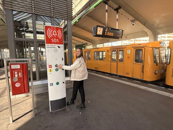 Lisa Randl, Projektleiterin Innovationsbahnhof Kottbusser Tor, zeigt die Notrufsäule.