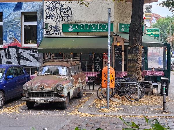 Stress mit den Behörden gab es oft. Doch der Opel ist fahrtüchtig und hat TÜV. Nur das zählt. Der Wagen darf auf dem kostenlosen öffentlichen Parkplatz stehen, solange er möchte und eine Plakette hat. Viele Passant:innen denken, das Auto gehöre zum Café direkt dahinter. Tourist:innen machen Fotos. In der Nachbarschaft ist bekannt, wem das Auto gehört.