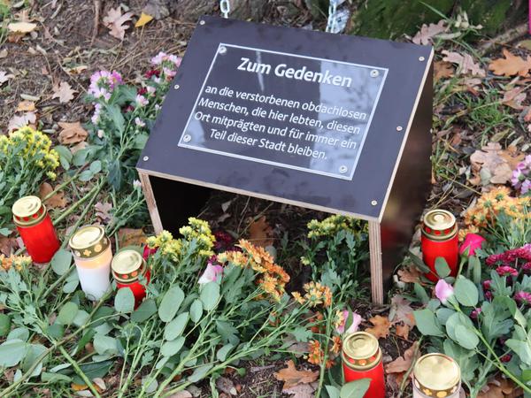 „Zum Gedenken an die verstorbenen obdachlosen Menschen, die hier lebten, diesen Ort mitprägten und für immer ein Teil dieser Stadt bleiben“, steht auf der wetterfesten Tafel.