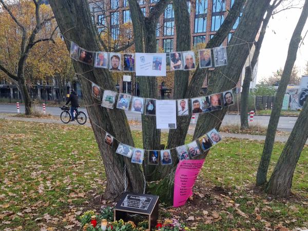 Um die Tafel zu sichern, ist sie an einen Baum auf einer Wiese vor dem Ostbahnhof gekettet. Adresse: Andreasstraße 18. Daneben hängen Fotos von 30 verstorbenen Obdachlosen, die in den vergangenen zehn Jahren hauptsächlich in dieser Gegend gelebt haben. Zur Aufstellung am Donnerstag kamen einige Freunde und Wegbegleiter.