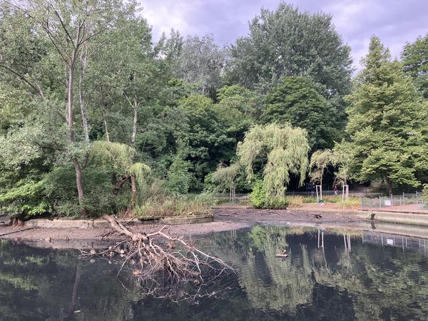 In einem Teil des Volksparks Friedrichshain stinkt es nach Fisch und Morast. Der große Teich ist mal wieder umgekippt, so wie schon letztes Jahr. Einige Anwohnende des Parks in Berlin sprechen nur noch vom „Stinketeich“. Das künstlich angelegte Becken hat keinen natürlich Zu- oder Ablauf, die Befüllung erfolgt über das Grundwasser, gefördert aus einem Tiefbrunnen. Wenn dann die Pumpen versagen, kippt die Anlage schnell.