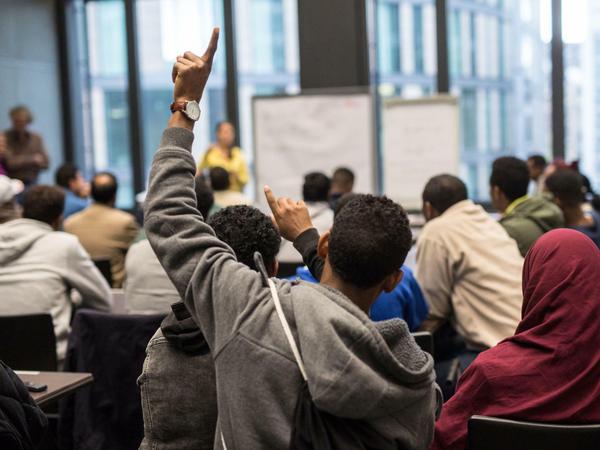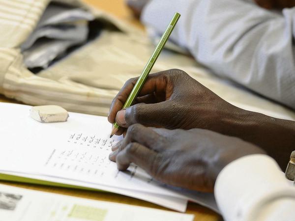 Der Unterricht von Katja T. ist kurzweilig. Zahlen aufsagen, leichte Quizübungen wechseln ab mit, Silbenlesen (ma, po, eu, ti), Wörterlesen (Sofa, Info, Tomate) oder Wörterlegen (mit ausgeschnittenen Buchstaben). Es wird konzentriert gearbeitet. Und auch viel gelacht. Dass zwei Übersetzerinnen anwesend sind, erleichtert die Verständigung.