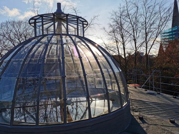 Doch vor zwei Jahren mussten Bauarbeiter der Villa auf das Dach steigen: Regenwasser tropfte von der Decke; die markante Glaskuppel, sie besteht aus 190 Scheiben, sowie die gesamte Dachfläche waren Sanierungsfälle. Im August 2021 begannen die Sanierungsarbeiten am denkmalgeschützten Gebäude, Ende 2022 waren sie abgeschlossen.