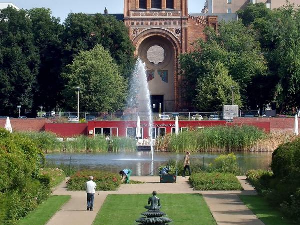 Am Kottbusser Tor ist es im Sommer heiß, stickig und voll, und die begehrten Plätze am nahe gelegenen Landwehrkanal oft schon belegt. Wer eine ruhige Oase sucht, findet in etwa der gleichen Entfernung in Richtung Norden das Engelbecken. Vom Oranienplatz aus gelangt man durch die Luisenstädtische Grünanlage, wo früher der gleichnamige Kanal floss, direkt bis ans historische Engelbecken. Das lag zu DDR-Zeiten im Mauerstreifen unter Schutt begraben und ist heute rekonstruiert: berankte Pergolen, Beete und Wasserfontänen - immer mit Blick auf die im zweiten Weltkrieg zerstörte und teilweise wieder aufgebaute Sankt-Michael-Kirche. Unter Rosenranken kann man ums Becken herum im Schatten spazieren und im Anschluss Kaffee, Kuchen, kleine Gerichte und abends auch Cocktails auf der Terrasse des Cafés genießen. Dort gibt es vielleicht nicht den schnellsten Service, aber man hat ja Zeit zu entspannen. (empfohlen von Sara Schurmann)