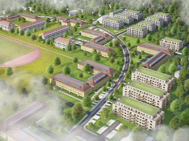 Links der Sportplatz, rechts die geplanten Neubauten.