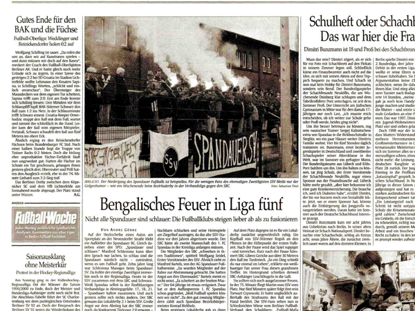Auch wir vom Tagesspiegel fanden es natürlich ganz, ganz schlimm, als beim Spandauer SV nicht nur der Nackensteak-Grill qualmte - wie hier 2000 beim Derby in der fünften Liga gegen SBC (die gibt’s - typisch Spandau! - auch nicht mehr).